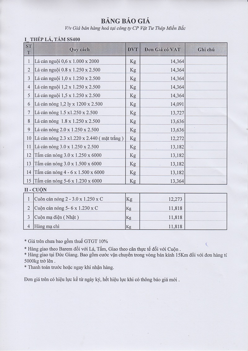 Bảng báo giá sắt thép tại Công ty CP Vật Tư Thép Miền Bắc (Từ 01/03/2017)